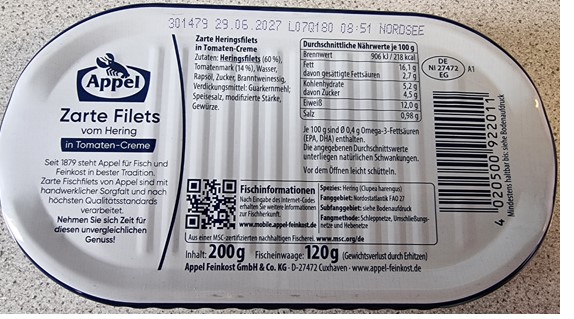 Chargennummer / Los-Kennzeichnung: EAN-Nummern für Ostsee Fisch Feine Heringsfilets nach Matjesart 300 Gramm: EAN 4013276160008 Ostsee Fisch Edle Matjesfilets 150 Gramm: EAN 4013276160022 Ostsee Fisch Kräutermatjes 150 Gramm: EAN 4013276160039 Ostsee Fisch Räuchermatjesfilets 150 Gramm: EAN 4013276160046 Rügen Fisch Räuchermatjesfilets 250 Gramm: EAN 4012839620256 Saßnitz Fisch Edler RügenMatjes Nordischer Art 300 Gramm: EAN 4013710740032 Saßnitz Fisch Kräuter Matjes nach Rügen Art 250 Gramm: EAN 4013710750093 Saßnitz Fisch Rauch Matjes Nordischer Art 250 Gramm: EAN 4013710760092